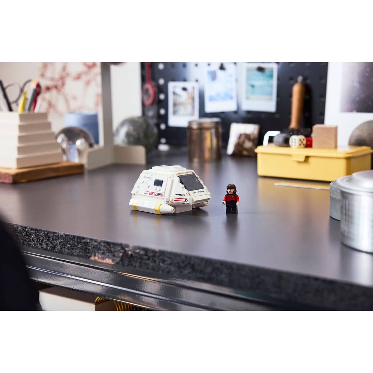 - LEGO® stickervel – deze scifi-modelset wordt geleverd met een stickervel om details toe te voegen, waaronder de naam van het voertuig, Onizuka, aan de buitenkant en het LCARS-scherm aan de binnenkant