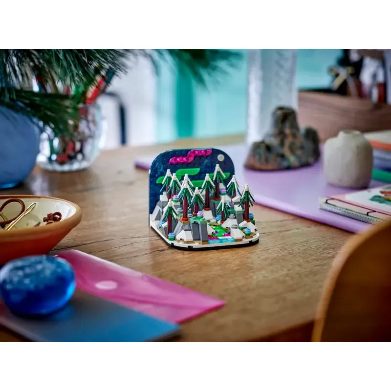 - Een noorderlicht dioramaset – dit LEGO® Noorderlicht diorama speelgoedmodel toont een boslandschap op het noordelijk halfrond, compleet met bomen en een nachtelijke hemel met de aurora borealis
